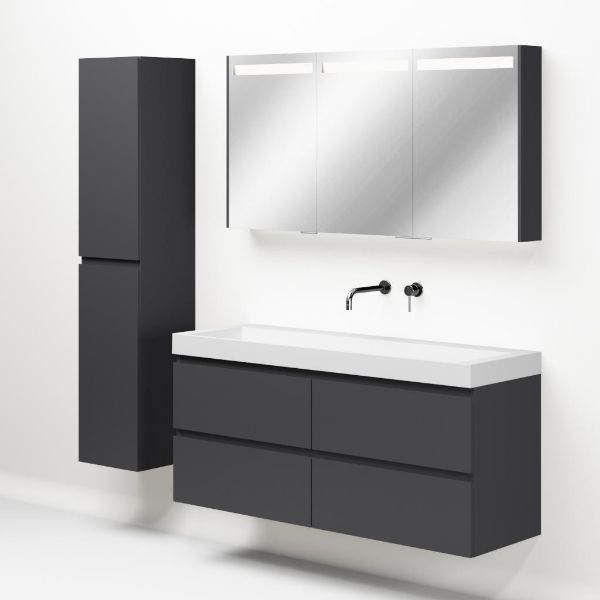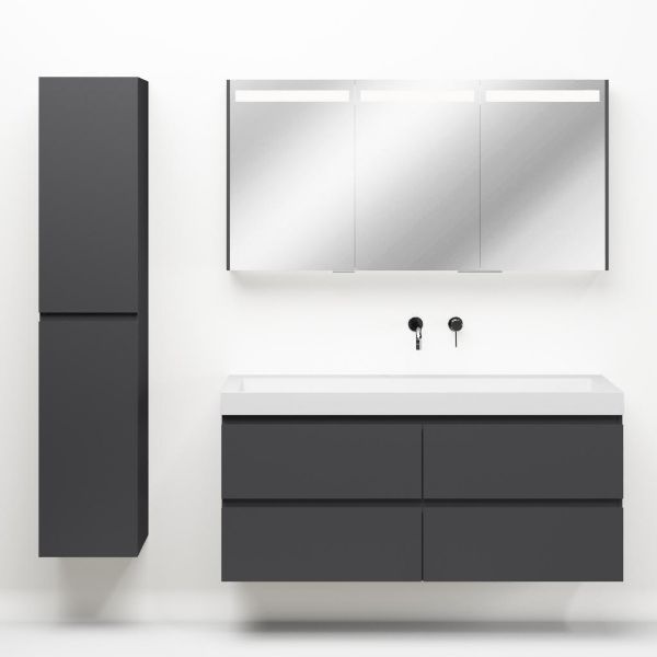 Greeploos badkamermeubel in de kleur antraciet mat is 140 cm breed. De wastafel is vervaardig in polystone en heeft de kleur wit. Dit badkamermeubel met deze wastafel is leverbaar tussen de 60 cm t/m 140 cm