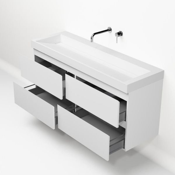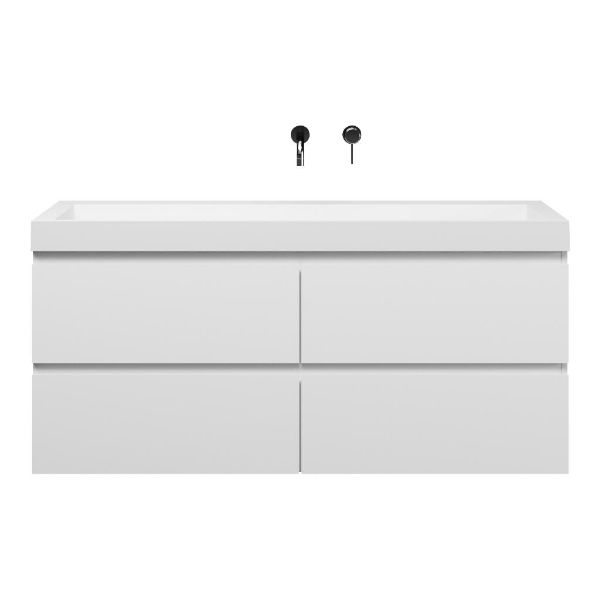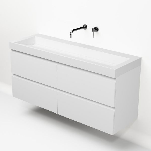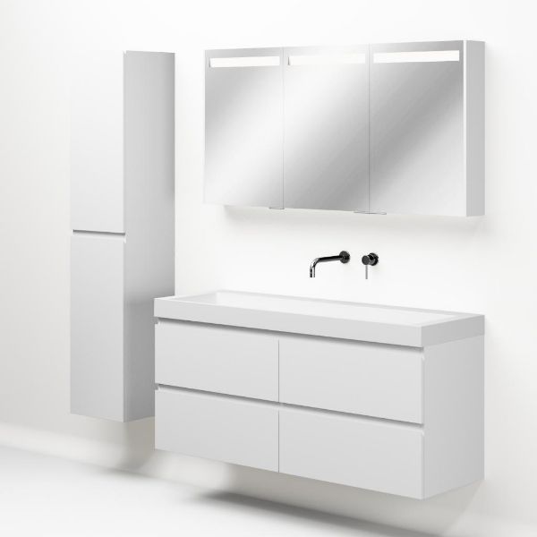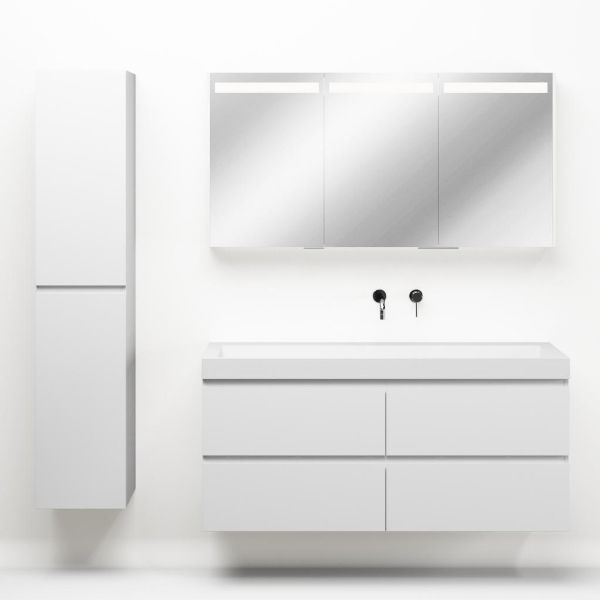 Greeploos badkamermeubel in de kleur wit mat is 140 cm breed. De wastafel is vervaardig in polystone en heeft de kleur wit. Dit badkamermeubel met deze wastafel is leverbaar tussen de 60 cm t/m 140 cm