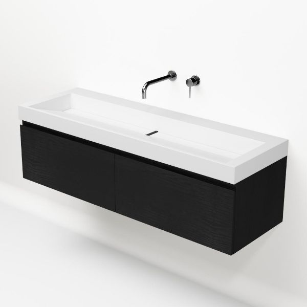 Greeploos badkamermeubel in de kleur zwart mat eiken is 140 cm breed. De wastafel is vervaardig in polystone en heeft de kleur wit. Dit badkamermeubel met deze wastafel is leverbaar tussen de 60 cm t/m 160 cm