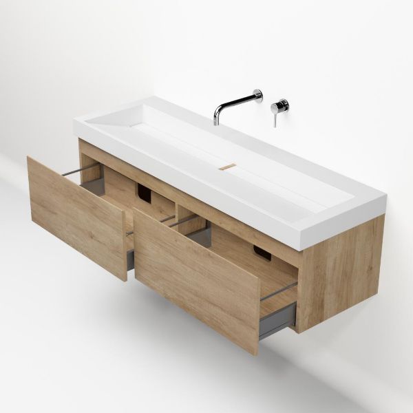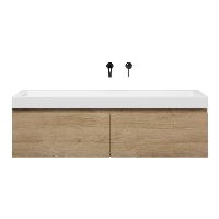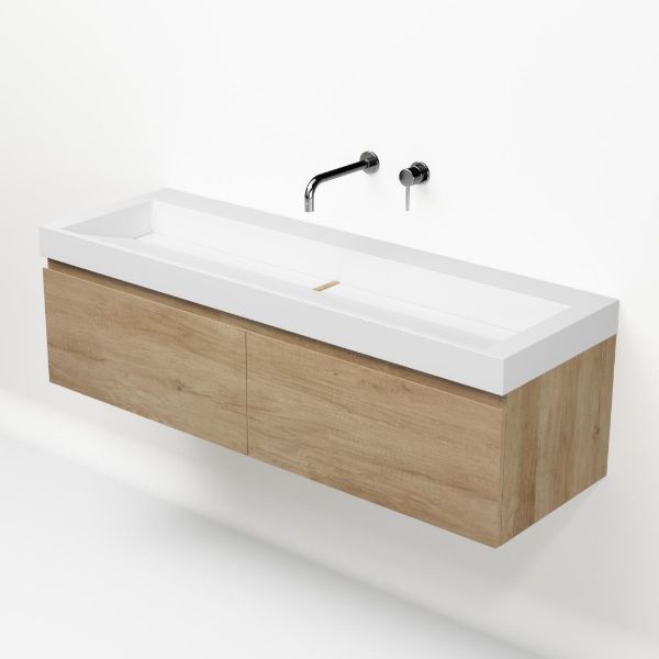 Greeploos badkamermeubel in de kleur olm is 140 cm breed. De wastafel is vervaardig in polystone en heeft de kleur wit. Dit badkamermeubel met deze wastafel is leverbaar tussen de 60 cm t/m 160 cm