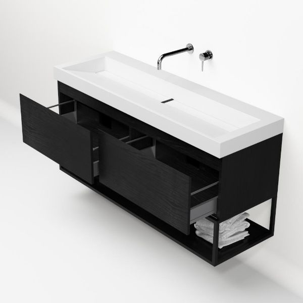 Greeploos badkamermeubel in de kleur zwart mat eiken is 140 cm breed. De wastafel is vervaardig in polystone en heeft de kleur wit. Dit badkamermeubel met deze wastafel is leverbaar tussen de 60 cm t/m 160 cm