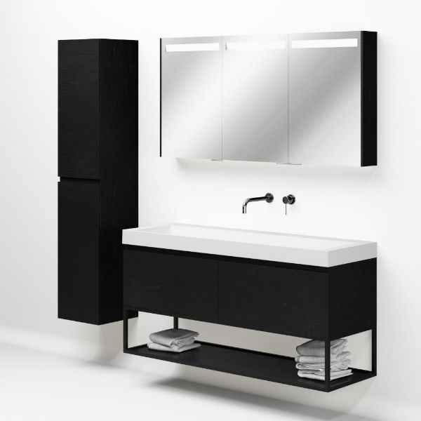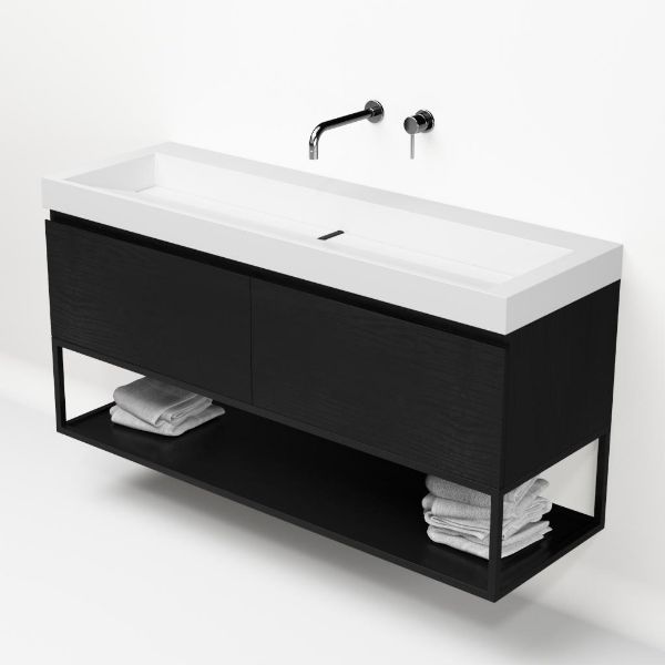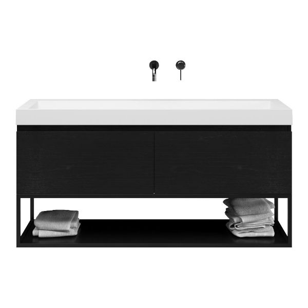 | | Bellanti Solo/Tela/Renzo badmeubel 140x46 2 softclose laden mat zwart eiken greeploos polystone wastafel wit zonder kraangaten met mat zwart metalen frame |