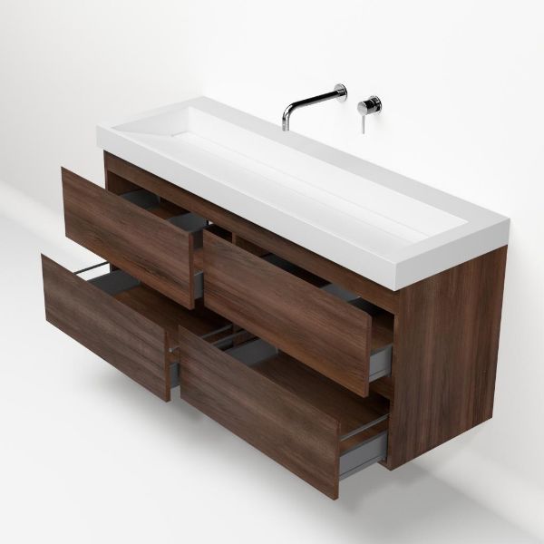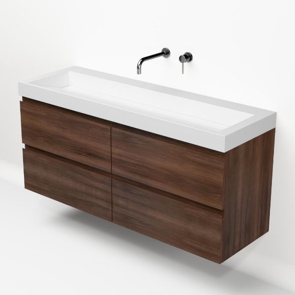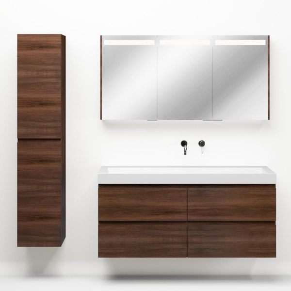 Greeploos badkamermeubel in de kleur walnoot is 140 cm breed. De wastafel is vervaardig in quartz en heeft de kleur wit mat quartz. Dit badkamermeubel met deze wastafel is leverbaar tussen de 60 cm t/m 140 cm