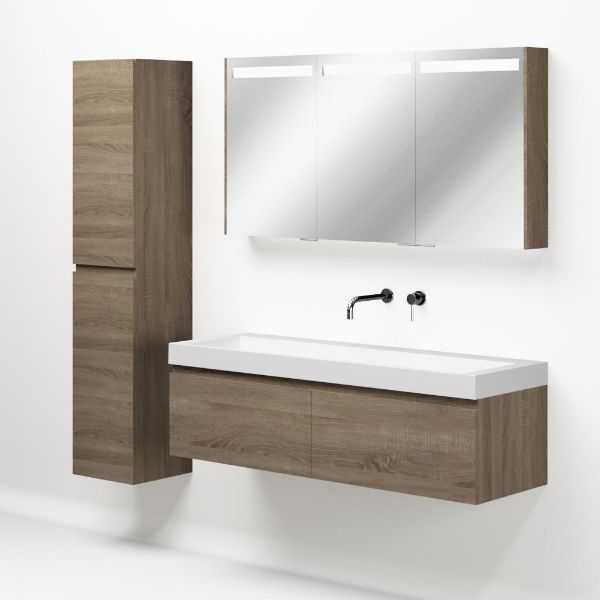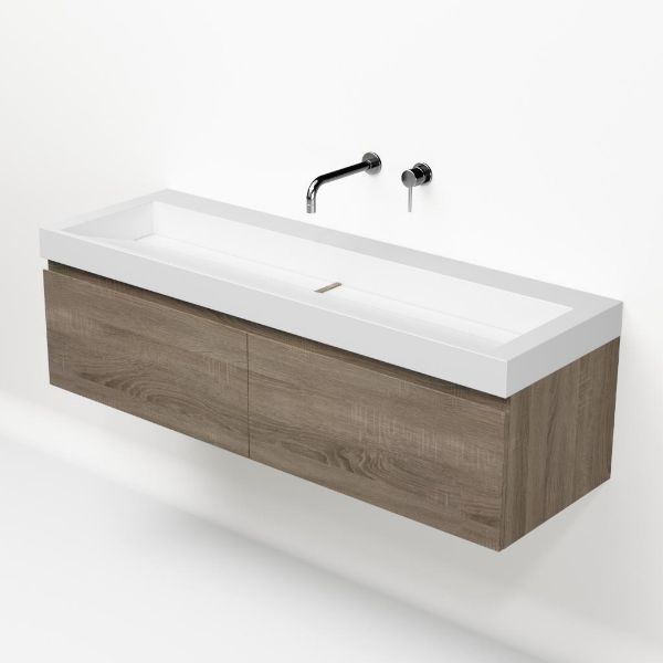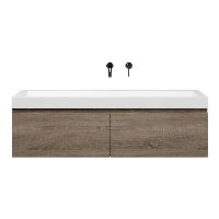 Greeploos badkamermeubel in de kleur eiken donker is 140 cm breed. De wastafel is vervaardig in quartz en heeft de kleur wit mat keramiek. Dit badkamermeubel met deze wastafel is leverbaar tussen de 60 cm t/m 160 cm
