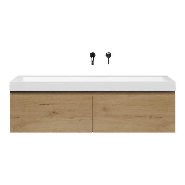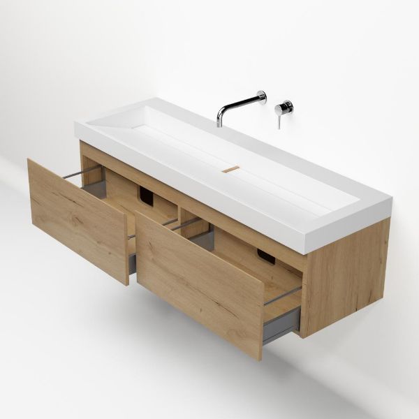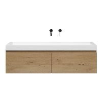 Greeploos badkamermeubel in de kleur eiken natuur is 140 cm breed. De wastafel is vervaardig in quartz en heeft de kleur wit mat keramiek. Dit badkamermeubel met deze wastafel is leverbaar tussen de 60 cm t/m 160 cm