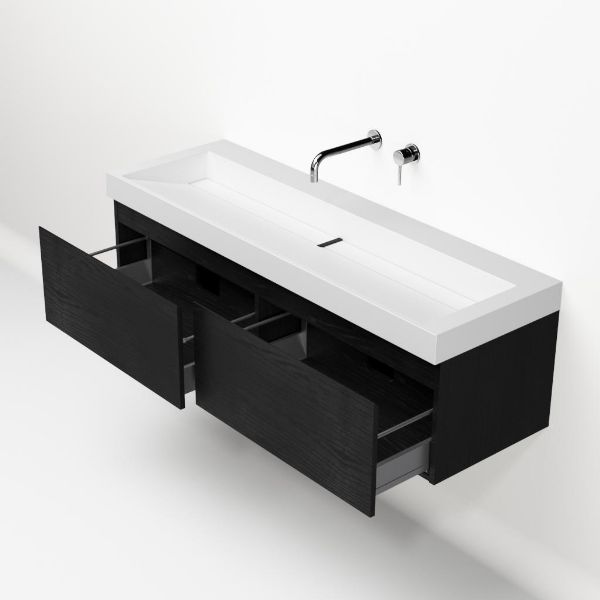 Greeploos badkamermeubel in de kleur zwart mat eiken is 140 cm breed. De wastafel is vervaardig in quartz en heeft de kleur wit mat keramiek. Dit badkamermeubel met deze wastafel is leverbaar tussen de 60 cm t/m 160 cm