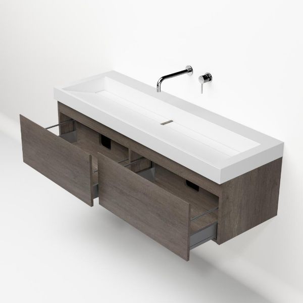 Greeploos badkamermeubel in de kleur olm donker grijs is 140 cm breed. De wastafel is vervaardig in quartz en heeft de kleur wit mat keramiek. Dit badkamermeubel met deze wastafel is leverbaar tussen de 60 cm t/m 160 cm