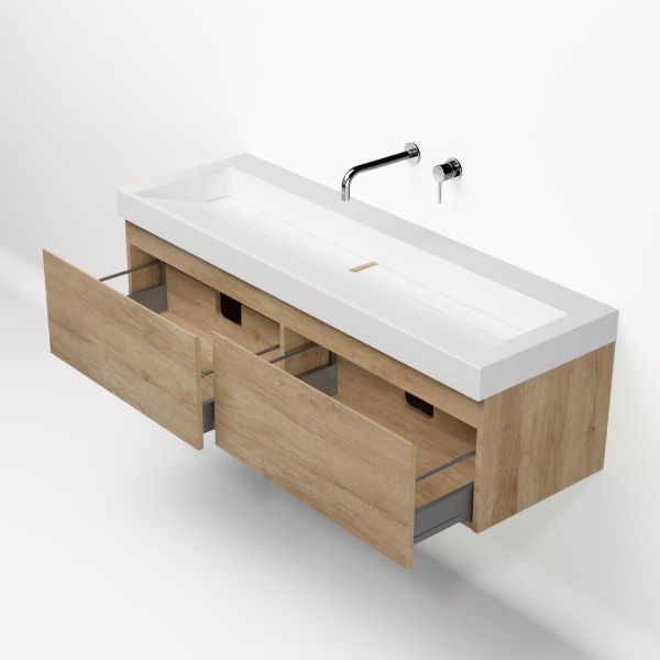 Greeploos badkamermeubel in de kleur olm is 140 cm breed. De wastafel is vervaardig in quartz en heeft de kleur wit mat keramiek. Dit badkamermeubel met deze wastafel is leverbaar tussen de 60 cm t/m 160 cm
