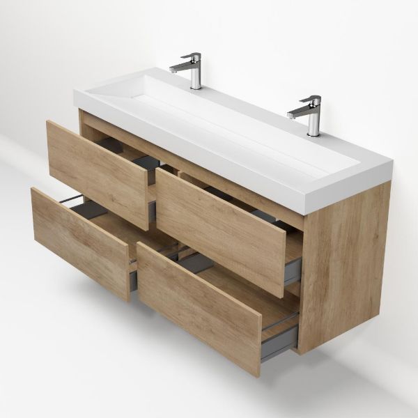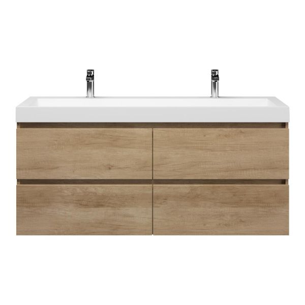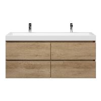 Greeploos badkamermeubel in de kleur olm is 140 cm breed. De wastafel is vervaardig in quartz en heeft de kleur wit mat keramiek. Dit badkamermeubel met deze wastafel is leverbaar tussen de 60 cm t/m 200 cm
