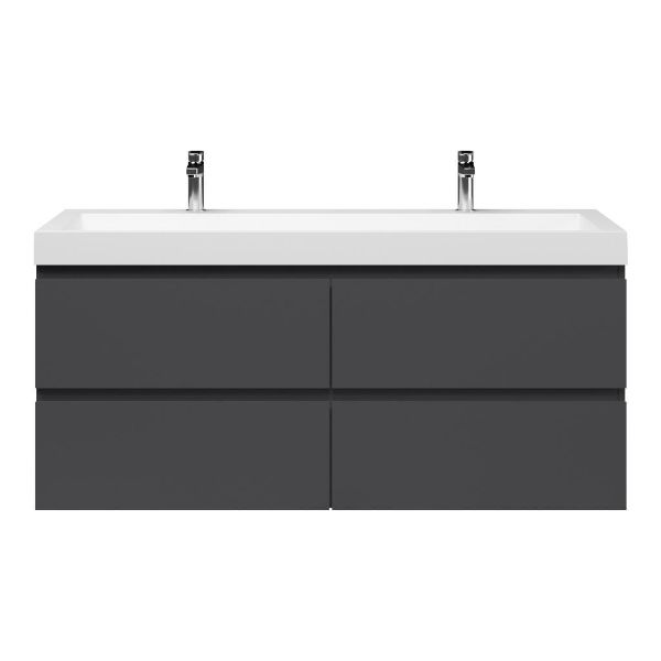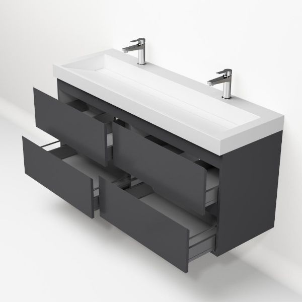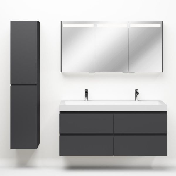 Greeploos badkamermeubel in de kleur antraciet mat is 140 cm breed. De wastafel is vervaardig in quartz en heeft de kleur wit mat quartz. Dit badkamermeubel met deze wastafel is leverbaar tussen de 60 cm t/m 140 cm