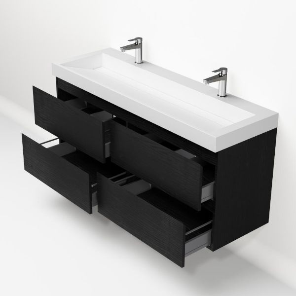 Greeploos badkamermeubel in de kleur zwart mat eiken is 140 cm breed. De wastafel is vervaardig in quartz en heeft de kleur wit mat quartz. Dit badkamermeubel met deze wastafel is leverbaar tussen de 60 cm t/m 140 cm
