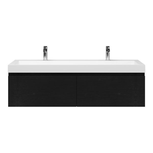 Greeploos badkamermeubel in de kleur zwart mat eiken is 140 cm breed. De wastafel is vervaardig in quartz en heeft de kleur wit mat keramiek. Dit badkamermeubel met deze wastafel is leverbaar tussen de 60 cm t/m 160 cm