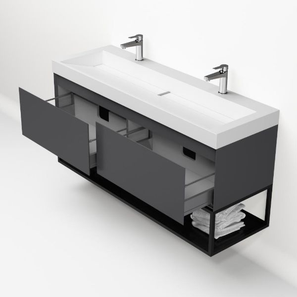 Greeploos badkamermeubel in de kleur antraciet mat is 140 cm breed. De wastafel is vervaardig in quartz en heeft de kleur wit mat keramiek. Dit badkamermeubel met deze wastafel is leverbaar tussen de 60 cm t/m 160 cm