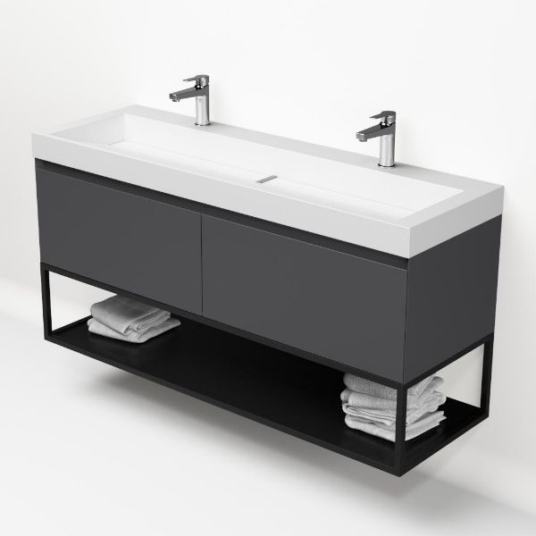 | | Bellanti Solo/Tela/Renzo-q badmeubel 140x46 2 softclose laden antraciet mat greeploos wastafel mat wit met 2 kraangaten met mat zwart metalen frame |