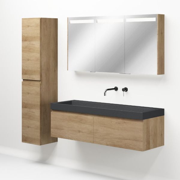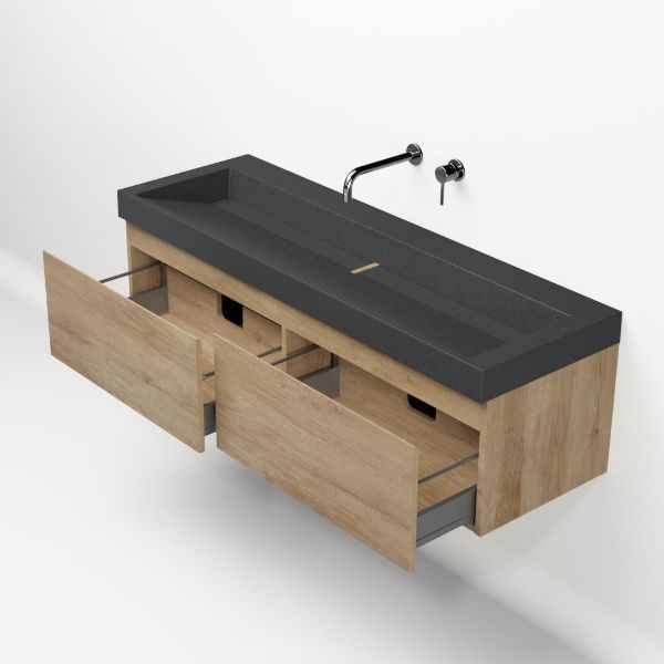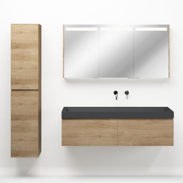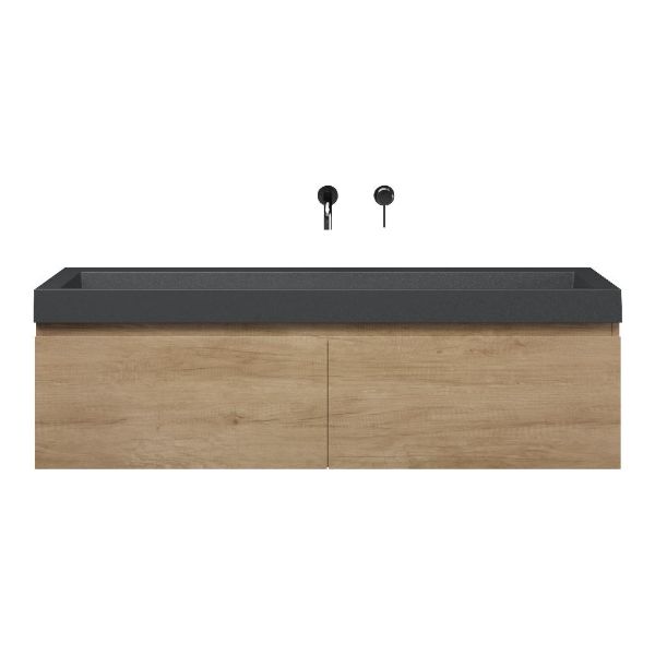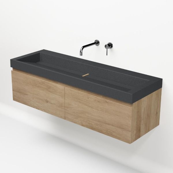 Greeploos badkamermeubel in de kleur olm is 140 cm breed. De wastafel is vervaardig in quartz en heeft de kleur grijs mat quartz. Dit badkamermeubel met deze wastafel is leverbaar tussen de 60 cm t/m 160 cm