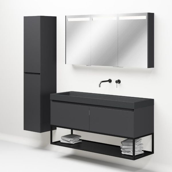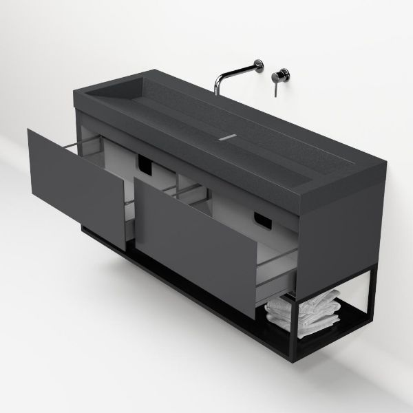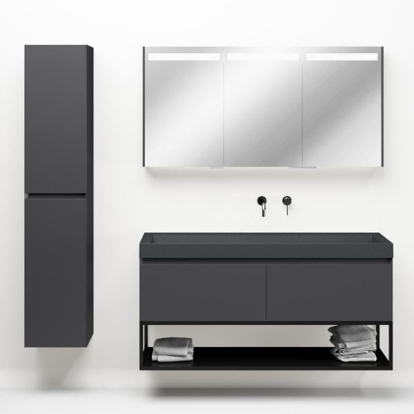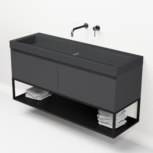 | | Bellanti Solo/Tela/Renzo-q badmeubel 140x46 2 softclose laden antraciet mat greeploos quartz wastafel mat grijs zonder kraangaten met mat zwart metalen frame |