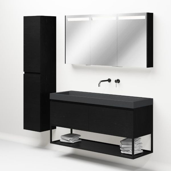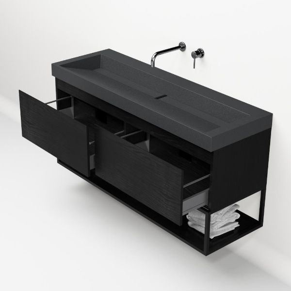 Greeploos badkamermeubel in de kleur zwart mat eiken is 140 cm breed. De wastafel is vervaardig in quartz en heeft de kleur grijs mat quartz. Dit badkamermeubel met deze wastafel is leverbaar tussen de 60 cm t/m 160 cm