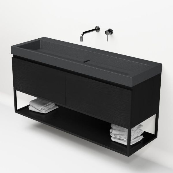 | Bellanti Solo/Tela/Renzo-q badmeubel 140x46 2 softclose laden mat zwart eiken greeploos quartz wastafel mat grijs zonder kraangaten met mat zwart metalen frame |