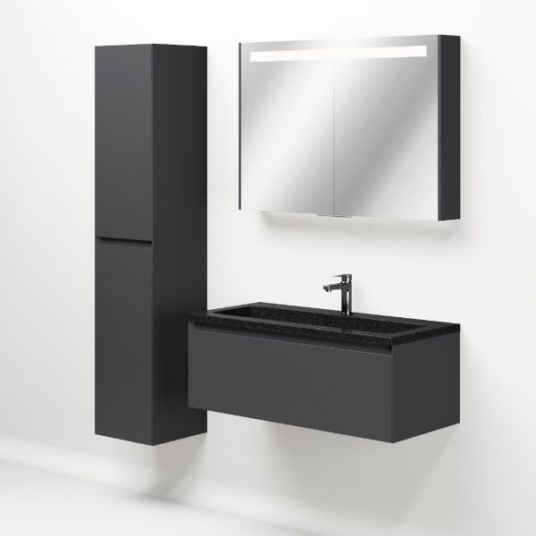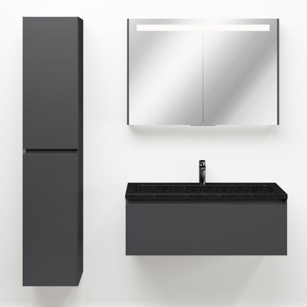 Greeploos badkamermeubel in de kleur antraciet mat is 100 cm breed. De wastafel is vervaardig in natuursteen en heeft de kleur shanxi black. Dit badkamermeubel met deze wastafel is leverbaar tussen de 60 cm t/m 120 cm