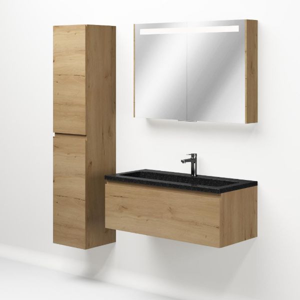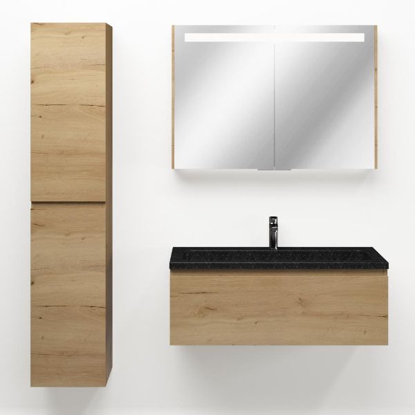 Greeploos badkamermeubel in de kleur eiken natuur is 100 cm breed. De wastafel is vervaardig in natuursteen en heeft de kleur shanxi black. Dit badkamermeubel met deze wastafel is leverbaar tussen de 60 cm t/m 120 cm