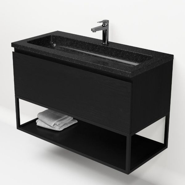 | | Bellanti Solo/Tela/Square badmeubel 100x46 1 softclose lade mat zwart eiken greeploos natuursteen wastafel shanxi black met 1 kraangat met mat zwart metalen frame |