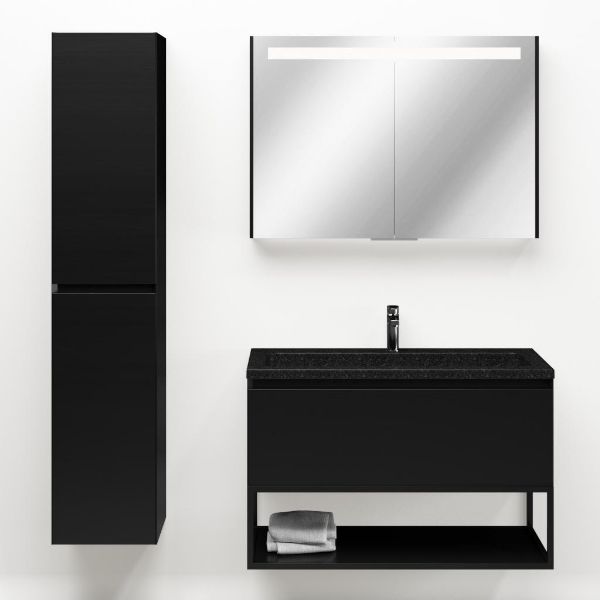Greeploos badkamermeubel in de kleur zwart mat is 100 cm breed. De wastafel is vervaardig in natuursteen en heeft de kleur shanxi black. Dit badkamermeubel met deze wastafel is leverbaar tussen de 60 cm t/m 120 cm