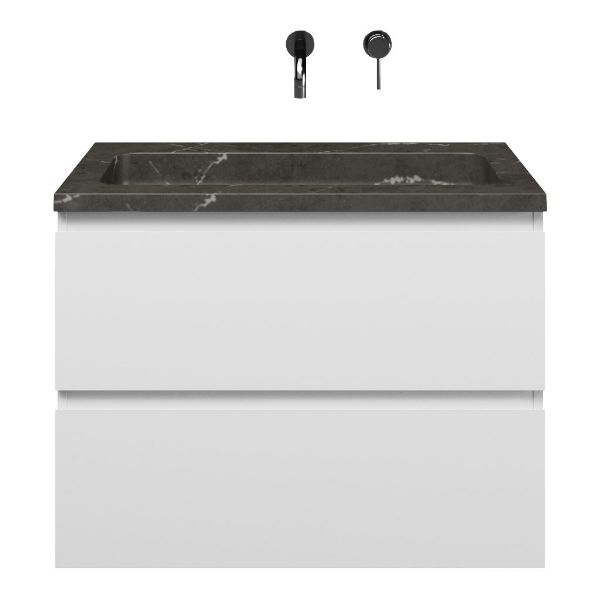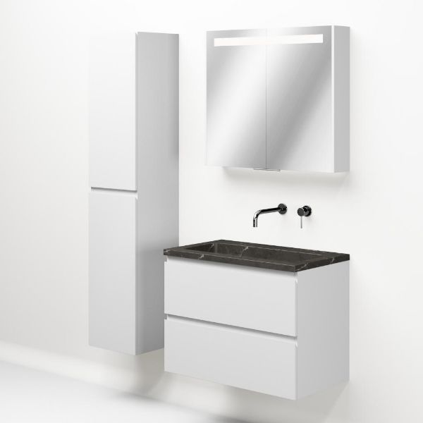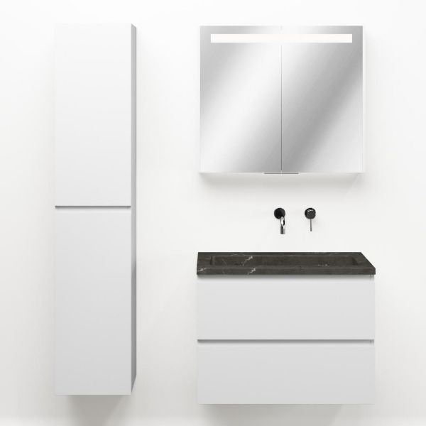 Greeploos badkamermeubel in de kleur wit mat is 80 cm breed. De wastafel is vervaardig in natuursteen en heeft de kleur blue stone. Dit badkamermeubel met deze wastafel is leverbaar tussen de 60 cm t/m 120 cm