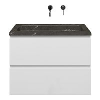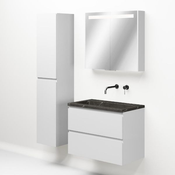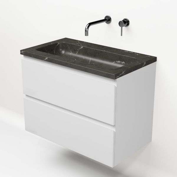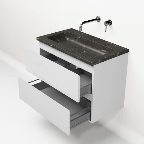 Greeploos badkamermeubel in de kleur wit hoogglans is 80 cm breed. De wastafel is vervaardig in natuursteen en heeft de kleur blue stone. Dit badkamermeubel met deze wastafel is leverbaar tussen de 60 cm t/m 120 cm