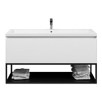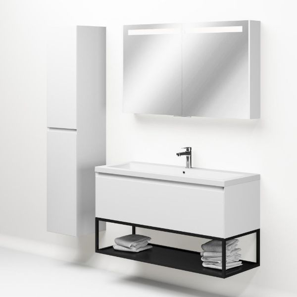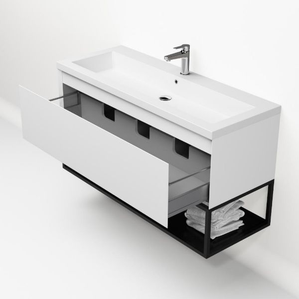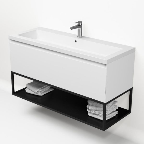 | | Bellanti Solo/Tela/Esta badmeubel 120x46 1 softclose lade wit mat greeploos polystone wastafel enkel, wit met 1 kraangat met mat zwart metalen frame |