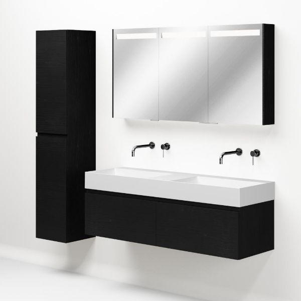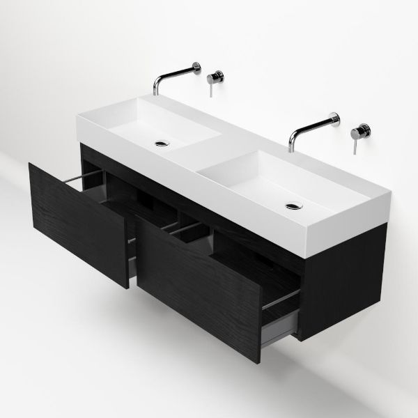 | Bellanti Solo/Azzurra badmeubel 140x46 2 softclose laden mat zwart eiken greeploos keramische wastafel dubbel wit mat zonder kraangaten |