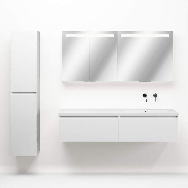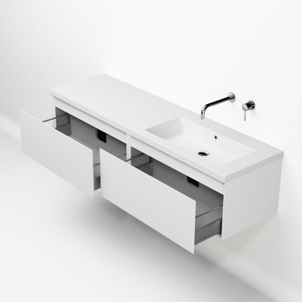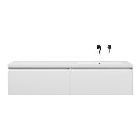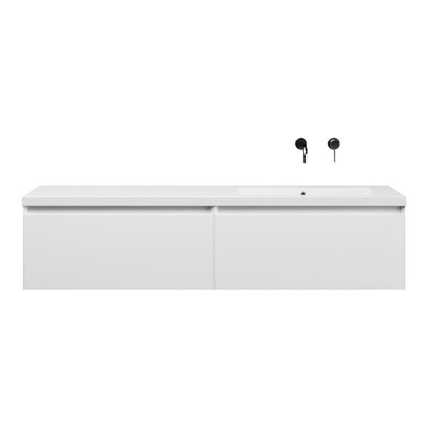 Greeploos badkamermeubel in de kleur wit mat is 160 cm breed. De wastafel is vervaardig in polystone en heeft de kleur wit. Dit badkamermeubel met deze wastafel is leverbaar tussen de 60 cm t/m 200 cm