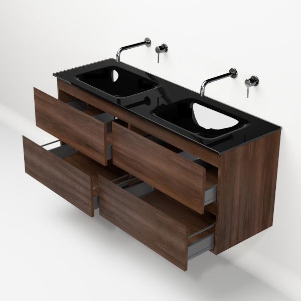 | Bellanti Gisella/Glass badmeubel 140x46 4 softclose laden walnoot greeploos glazen wastafel dubbel zwart zonder kraangaten |