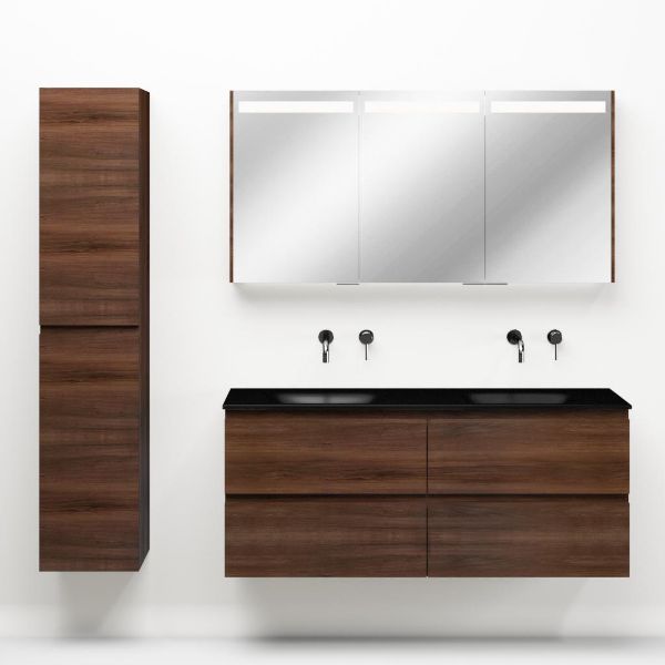 Greeploos badkamermeubel in de kleur walnoot is 140 cm breed. De wastafel is vervaardig in glas en heeft de kleur zwart mat. Dit badkamermeubel met deze wastafel is leverbaar tussen de 60 cm t/m 140 cm