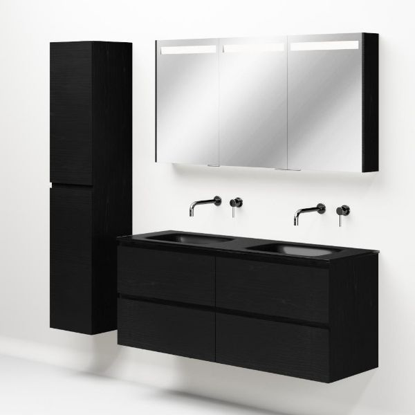 Greeploos badkamermeubel in de kleur zwart mat eiken is 140 cm breed. De wastafel is vervaardig in glas en heeft de kleur zwart mat. Dit badkamermeubel met deze wastafel is leverbaar tussen de 60 cm t/m 140 cm