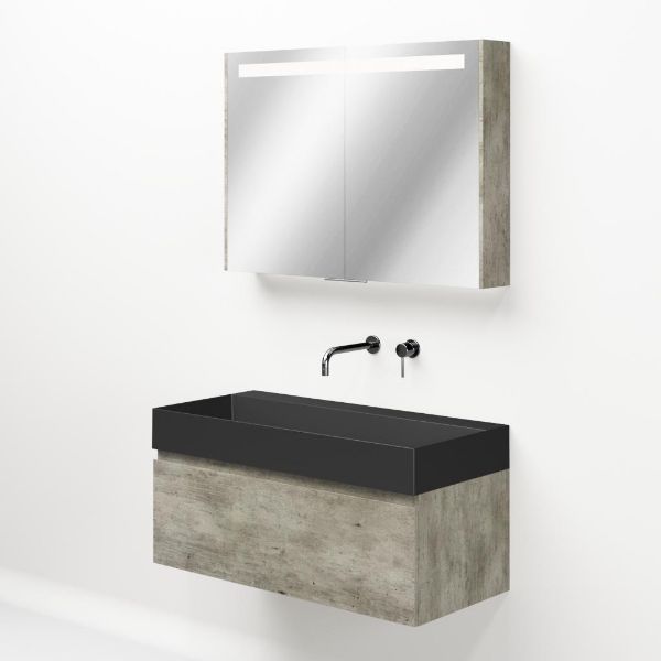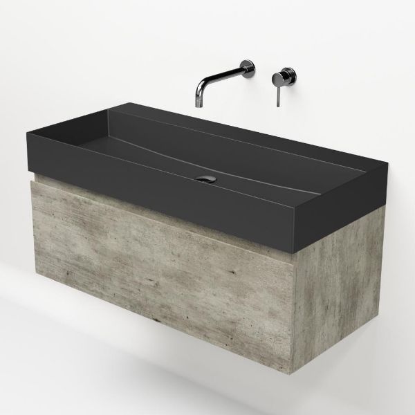 | Bellanti Solo/Azzurra badmeubel 100x46 1 softclose lade steigerhout look grijs greeploos keramische wastafel antraciet mat zonder kraangaten |