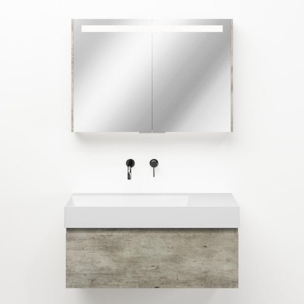 Greeploos badkamermeubel in de kleur steigerhout licht grijs is 100 cm breed. De wastafel is vervaardig in keramiek en heeft de kleur wit keramiek. Dit badkamermeubel met deze wastafel is leverbaar tussen de 60 cm t/m 160 cm