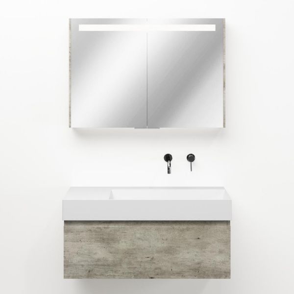 Greeploos badkamermeubel in de kleur steigerhout licht grijs is 100 cm breed. De wastafel is vervaardig in keramiek en heeft de kleur wit keramiek. Dit badkamermeubel met deze wastafel is leverbaar tussen de 60 cm t/m 160 cm