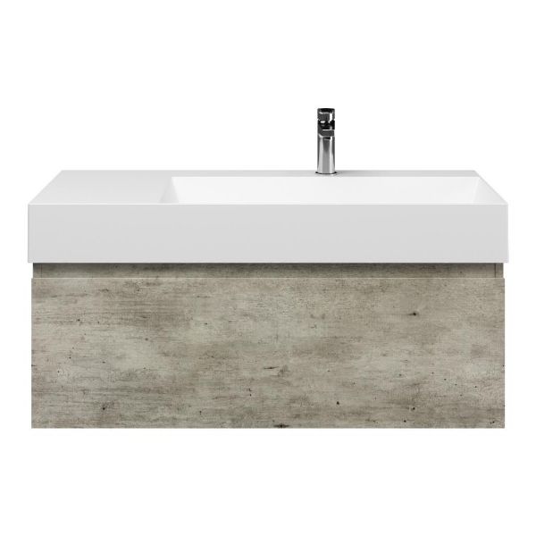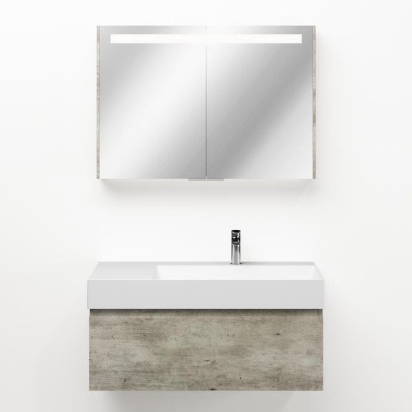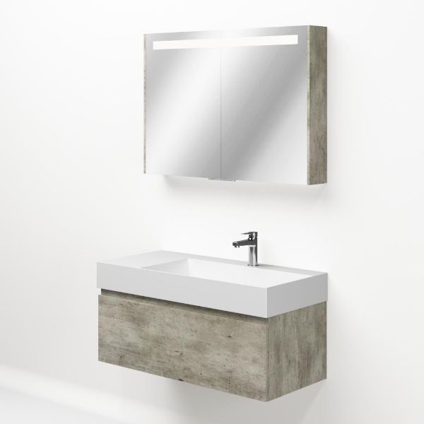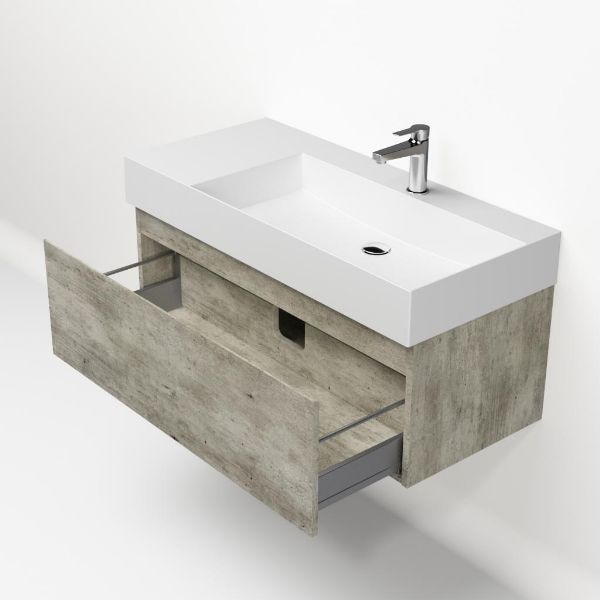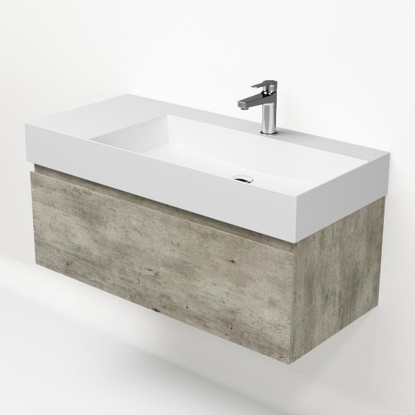 | Bellanti Solo/Azzurra badmeubel 100x46 1 softclose lade steigerhout look grijs greeploos keramische wastafel rechts wit mat met 1 kraangat |