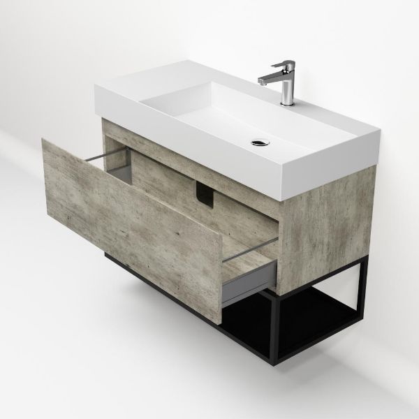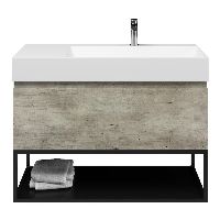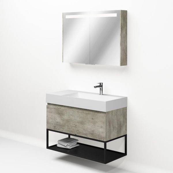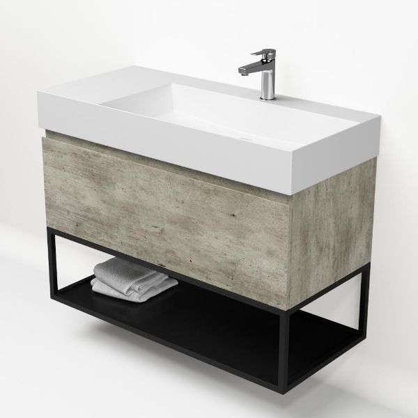 | | Bellanti Solo/Tela/Azzurra badmeubel 100x46 1 softclose lade steigerhout look grijs greeploos keramische wastafel rechts wit mat met 1 kraangat met mat zwart metalen frame |