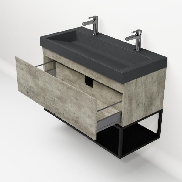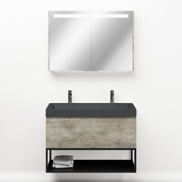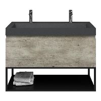 | | Bellanti Solo/Tela/Renzo-q badmeubel 100x46 1 softclose lade steigerhout look grijs greeploos quartz wastafel mat grijs met 2 kraangaten met mat zwart metalen frame |
