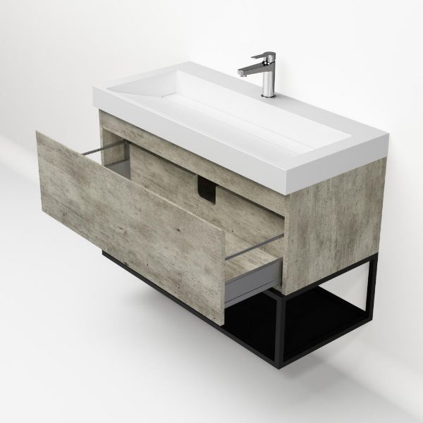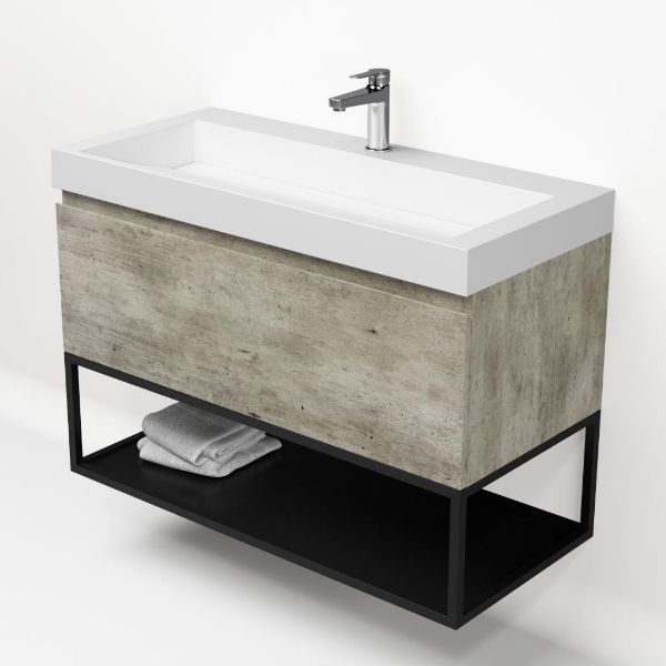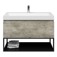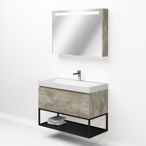 | | Bellanti Solo/Tela/Renzo-q badmeubel 100x46 1 softclose lade steigerhout look grijs greeploos quartz wastafel mat wit met 1 kraangat met mat zwart metalen frame |