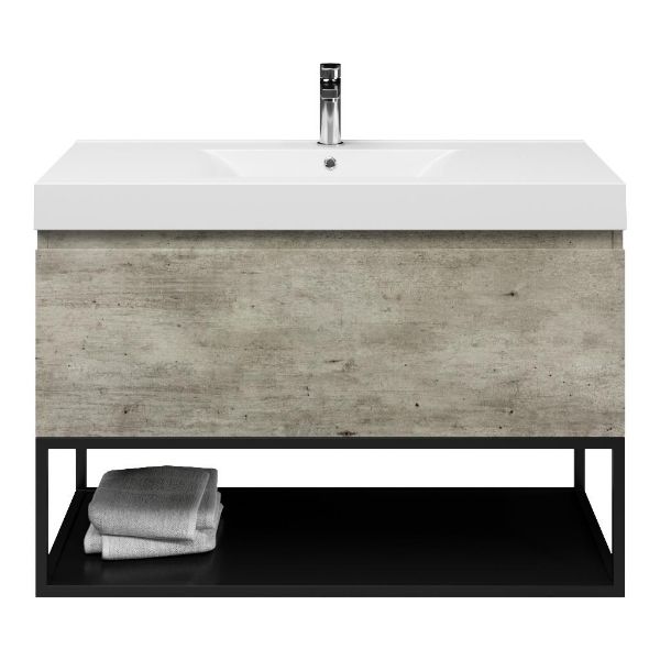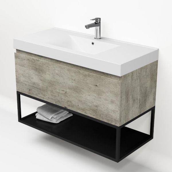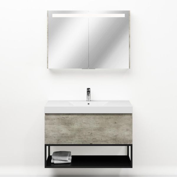 | | Bellanti Solo/Tela/Wave badmeubel 100x46 1 softclose lade steigerhout look grijs greeploos polystone wastafel wit met 1 kraangat met mat zwart metalen frame |