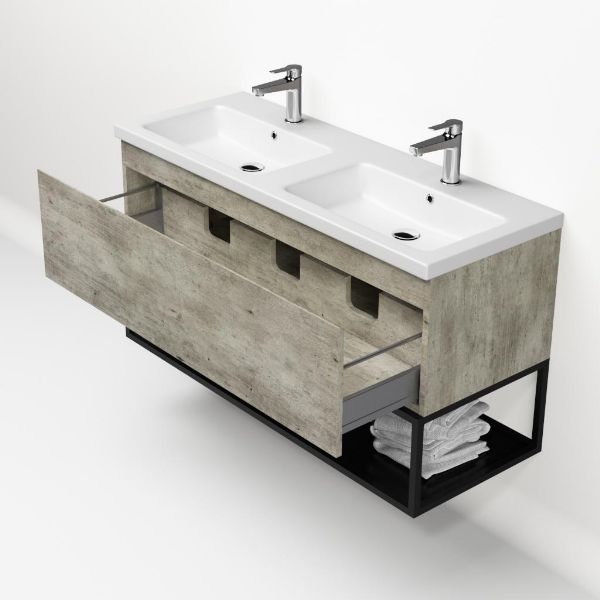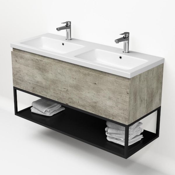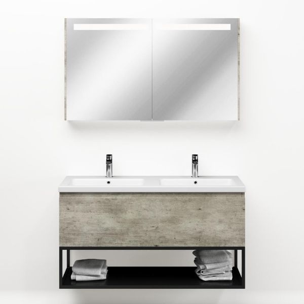 | | Bellanti Solo/Tela /Amelia badmeubel 120x46 1 softclose lade steigerhout look grijs greeploos keramische wastafel dubbel wit mat met 2 kraangaten met mat zwart metalen frame |