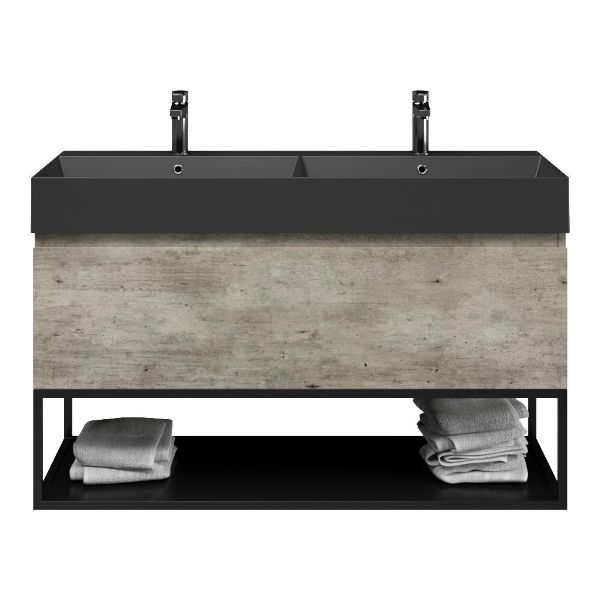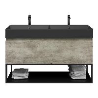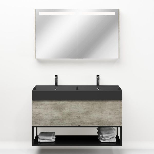 Bellanti Solo/Tela /Azzurra badmeubel 120x46 1 softclose lade steigerhout look grijs greeploos keramische wastafel dubbel antraciet mat met 2 kraangaten met mat zwart metalen frame
