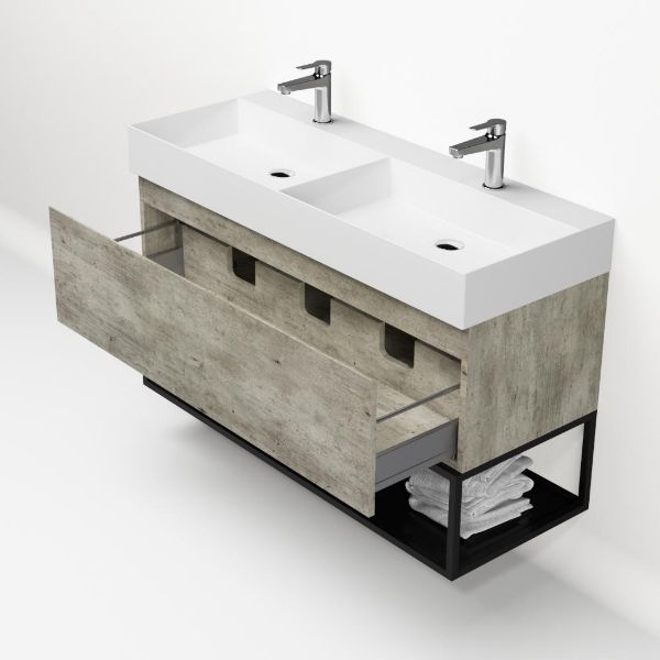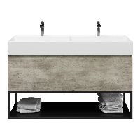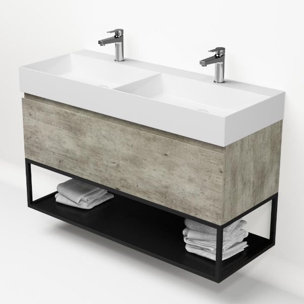 Bellanti Solo/Tela /Azzurra badmeubel 120x46 1 softclose lade steigerhout look grijs greeploos keramische wastafel dubbel wit glans met 2 kraangaten met mat zwart metalen frame