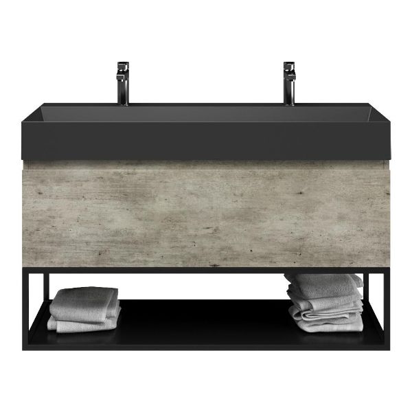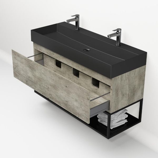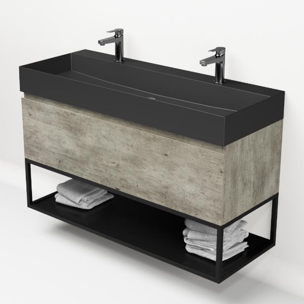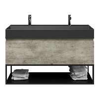 | | Bellanti Solo/Tela /Azzurra badmeubel 120x46 1 softclose lade steigerhout look grijs greeploos keramische wastafel enkel antraciet mat met 2 kraangaten met mat zwart metalen frame |