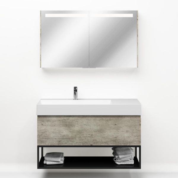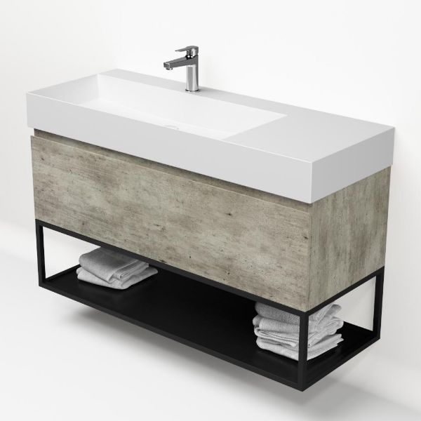 | | Bellanti Solo/Tela /Azzurra badmeubel 120x46 1 softclose lade steigerhout look grijs greeploos keramische wastafel links wit mat met 1 kraangat met mat zwart metalen frame |