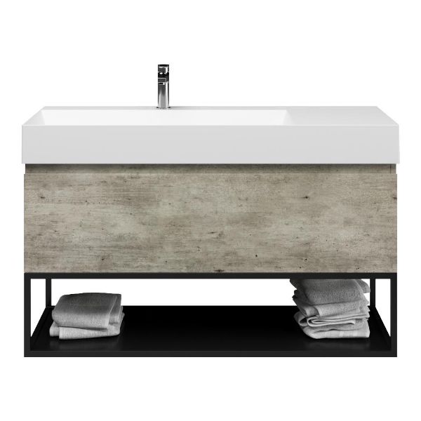 | Bellanti Solo/Tela /Azzurra badmeubel 120x46 1 softclose lade steigerhout look grijs greeploos keramische wastafel links wit mat met 1 kraangat met mat zwart metalen frame |