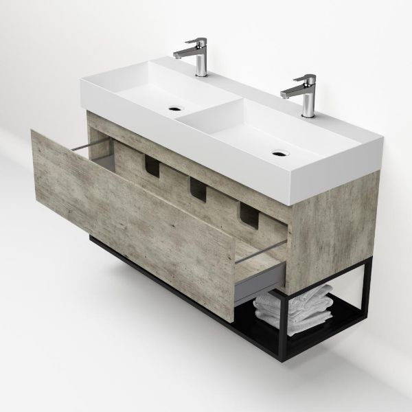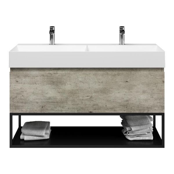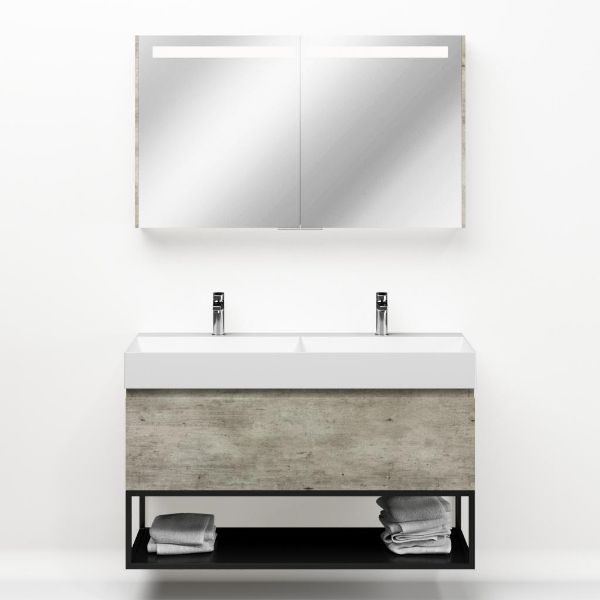 Bellanti Solo/Tela/Azzurra badmeubel 120x46 1 softclose lade steigerhout look grijs greeploos keramische wastafel dubbel wit mat met 2 kraangaten met mat zwart metalen frame