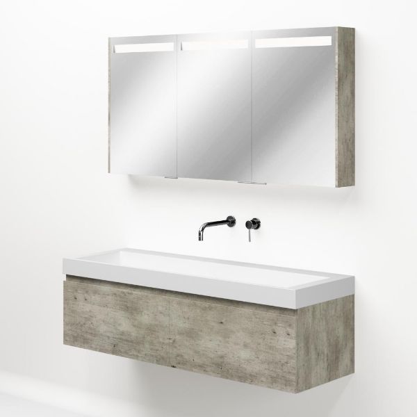 Greeploos badkamermeubel in de kleur steigerhout licht grijs is 140 cm breed. De wastafel is vervaardig in quartz en heeft de kleur wit mat keramiek. Dit badkamermeubel met deze wastafel is leverbaar tussen de 60 cm t/m 160 cm